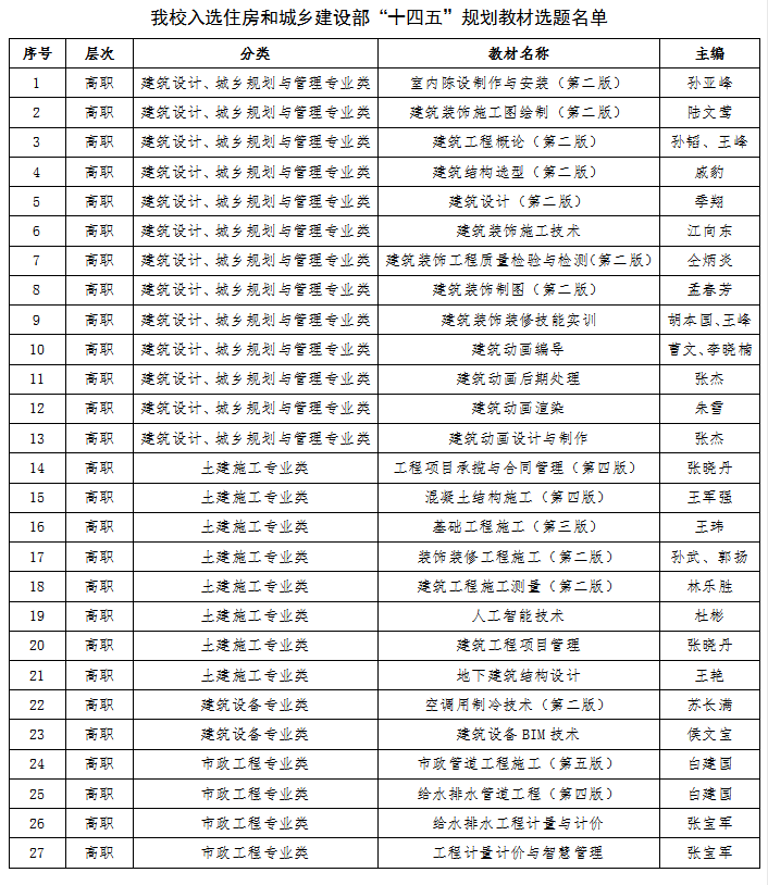 近日,住建部发布了《住房和城乡建设部关于印发高等教育职业教育住房和城乡建设领域学科专业“十四五”规划教材选题的通知》(建人函〔2021〕36号),公布高等教育职业教育住房和城乡建设领域学科专业“十四五”规划教材选题名单,我校共计27部教材入选高职组名单。其中,建筑设计、城乡规划与管理专业类13部,土建施工专业类8部,建筑设备专业类2部,市政工程专业类4部。