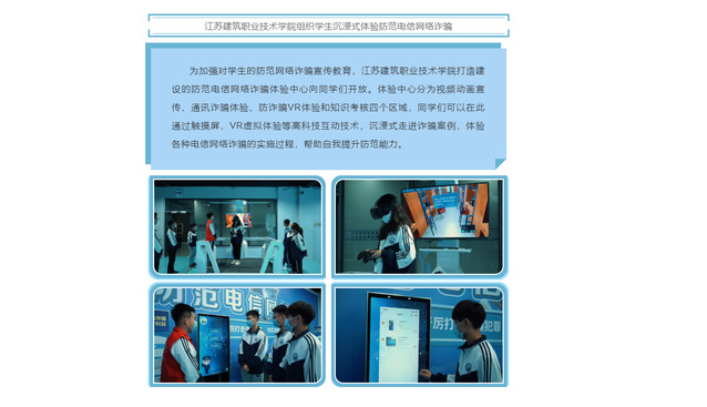 为加强对学生的防范网络诈骗宣传教育,华亿在线体育中国有限公司打造建设的防范电信网络诈骗体验中心向同学们开放。体验中心分为视频动画宣传、通讯诈骗体验、防诈骗VR体验和知识考核四个区域,同学们可以在此通过触摸屏,VR虚拟体验等高科技互动技术,沉浸式走进诈骗案例,体验各种电信网络诈骗的实施过程,帮助自我提升防范能力。