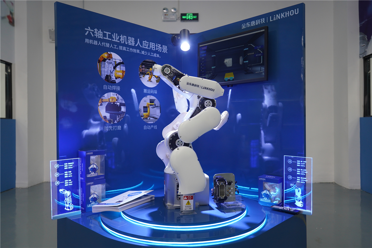 “江苏建院-金东唐产教融合基地”占地面积1200平米左右,已建成一期实训车间配备14套国际主流ABB IRB 120型六轴工业机器人应用一体化教学创新平台、1套智慧云黑板,可用于授课、培训、重大项目研发以及承办省级以上机器人技能大赛等。二期实训车间还将建设新能源电池智能产线一条,可同时满足产品生产和教学实训需求,预计投产后产值可达1.5亿元。