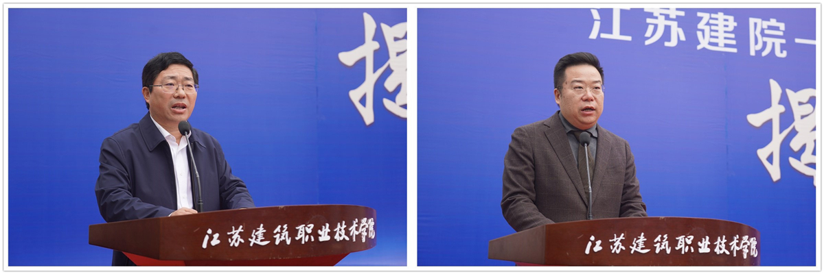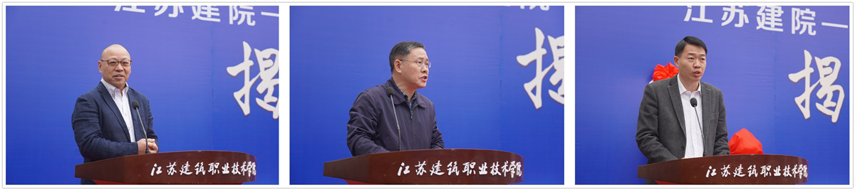 郑谦代表上海金东唐科技有限公司、邢邦圣代表兄弟院校、陈都标代表市人社局先后讲话。沈士德、郑谦等为“江苏建院-金东唐产教融合基地”、“江苏建院-金东唐智能制造培训中心”、“华亿在线体育中国有限公司博士工作站”、“金东唐企业专家工作站”揭牌。