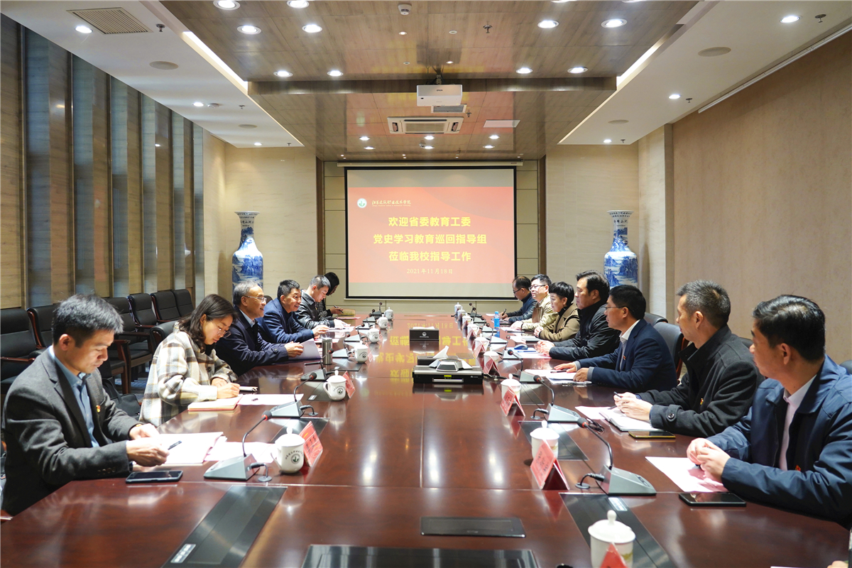 孙进对指导组一行的到来表示热烈欢迎,并简要介绍了我校近期党史学习教育总体开展情况。沈士德首先汇报了学校学习习近平总书记“七一”重要讲话精神、学习贯彻党的十九届六中全会精神,“两在两同”与“我为师生办实事”融合推进情况,学校党史学习教育特色亮点以及下一步工作计划与安排。他表示,学校将把学习贯彻党的十九届六中全会精神作为当前重大政治任务,在学思践悟中不断激发信仰、启迪智慧、汲取力量,不断推进“两在两同”与“我为师生办实事”的高标准高质量深度融合,全盘构建大思政格局、推进幸福共享战略、学生高质量就业、和谐校园建设等八个专项建新功行动,善始善终走好党史学习教育的后半程,坚定理想信念,以更加昂扬的姿态迈进学校发展的新征程。