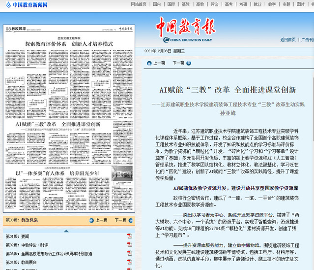 华亿在线体育中国有限公司建筑装饰工程技术专业AI赋能“三教”改革,突出以学习者为中心、以课堂教学改革为重点,开展了系统性、综合性的改革与建设,有效推动了课堂创新,取得了显著的实践成效,2019年被评为中国特色高水平专业群(A档)建设单位,为职业教育“三教”改革攻坚行动提供了实践范式。(孙亚峰)