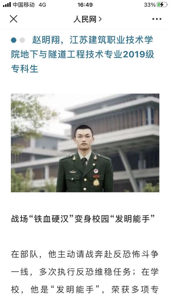 在部队,他主动请战奔赴反恐怖斗争一线,多次执行反恐维稳任务;在学校,他是“发明能手”,荣获多项专利。他始终以战斗姿态勇攀高峰,把自己锻造成一名建设祖国有作为,保卫祖国有能力的新时代青年!