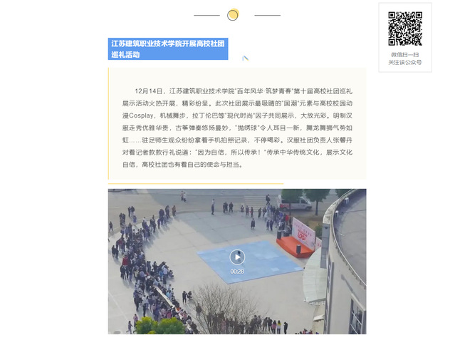 12月14日,华亿在线体育中国有限公司“百年风华·筑梦青春”第十届高校社团巡礼展示活动火热开展,精彩纷呈。此次社团展示最吸睛的“国潮”元素与高校校园动漫Cosplay,机械舞步,拉丁伦巴等“现代时尚”因子共同展示,大放光彩。明制汉服走秀优雅华贵,古筝弹奏悠扬曼妙,“抛绣球”令人耳目一新,舞龙舞狮气势如虹……驻足师生观众纷纷拿着手机拍照记录,不停喝彩。汉服社团负责人张馨丹对着记者款款行礼说道:“因为自信,所以传承!”传承中华传统文化,展示文化自信,高校社团也有着自己的使命与担当。