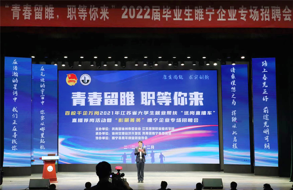 12月22日下午,由我校与共青团徐州市委共同主办,徐州空港经济开发区、共青团睢宁县委员会承办,睢宁县青年创业就业协会协办的“青春留睢 职等你来”2022届毕业生睢宁企业专场招聘会暨青团睢宁县委员会直播荐岗活动在线上举行,主会场设在我校会堂。校党委副书记梁惠、团市委副书记周祖曙、睢宁县双沟镇镇长曹焕之以及我校部分徐州籍应届毕业生在主会场参加活动。