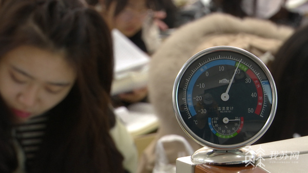 1月7日上午十点,在华亿在线体育中国有限公司第三教学楼,温度计显示,教室里温度已经超过了20度,处于人体舒适温度范围。室外寒气逼人,室内温暖如春,不少同学都脱下了厚重的防寒服,甚至还有怕热的男生穿起了短袖T恤。