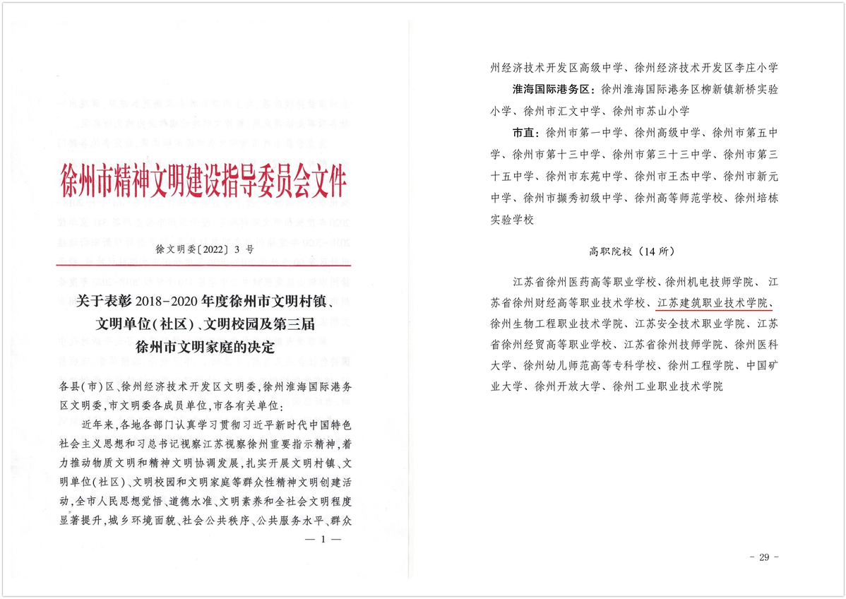 日前,徐州市精神文明建设指导委员会正式公布2018-2020年度徐州市文明单位、文明社区、文明村镇、文明校园名单,我校榜上有名,获评2018-2020年度徐州市文明校园称号。