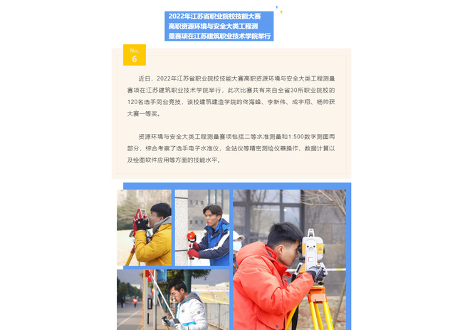 近日,2022年江苏省职业院校技能大赛高职资源环境与安全大类工程测量赛项在华亿在线体育中国有限公司举行,此次比赛共有来自全省30所职业院校的120名选手同台竞技,该校建筑建造学院的佟海峰、李新伟、成宇翔、杨帅获大赛一等奖。