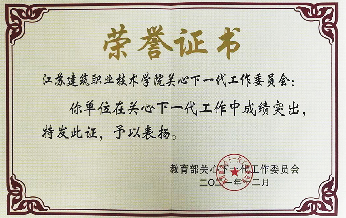 2021年度,我校关工委还收获了多项国家级、省级荣誉:贾平、任留钦、周厚思、刘小微等制作的微视频作品《五十年的执着》获教育部关工委2021年“读懂中国”活动“优秀微视频”奖;校关工委常务副主任任留钦获2021年度“全省教育系统关心下一代工作先进个人”荣誉称号;暖通19-1班孙溪获省教育系统关工委2021年主题教育读书征文活动二等奖,城运21-1班张天尧、装饰20-2班刘金金获三等奖。