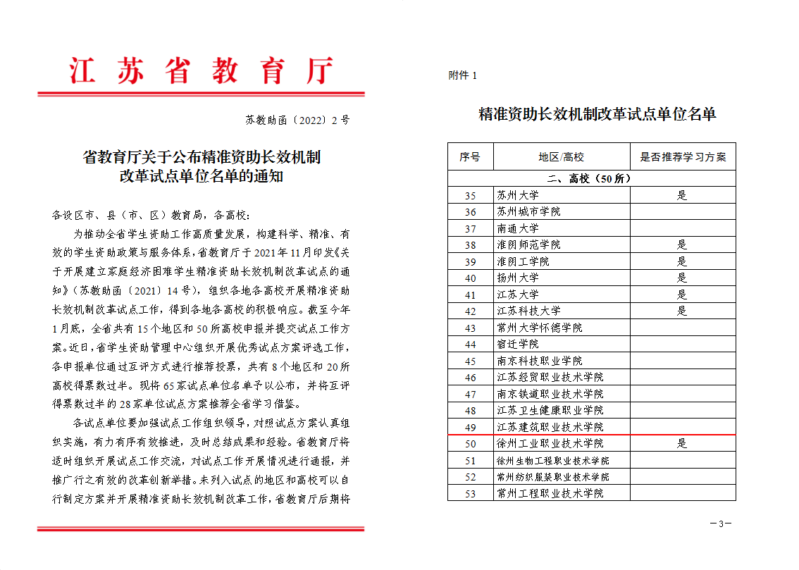近日,江苏省教育厅下发《关于公布精准资助长效机制改革试点单位名单的通知》(苏教助函〔2022〕2号),我校获批省级精准资助长效机制改革试点单位。