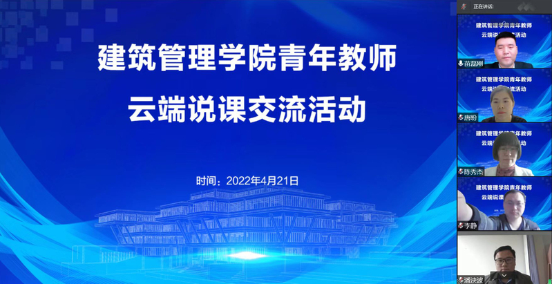 4月21日,建筑管理学院举办青年教师说课研修交流活动,受疫情影响,活动采用线上方式进行。教务处、人事处等相关部门负责人出席活动,建筑管理学院党政领导及全体专任教师参加活动。活动由建筑管理学院副院长苗磊刚主持。
