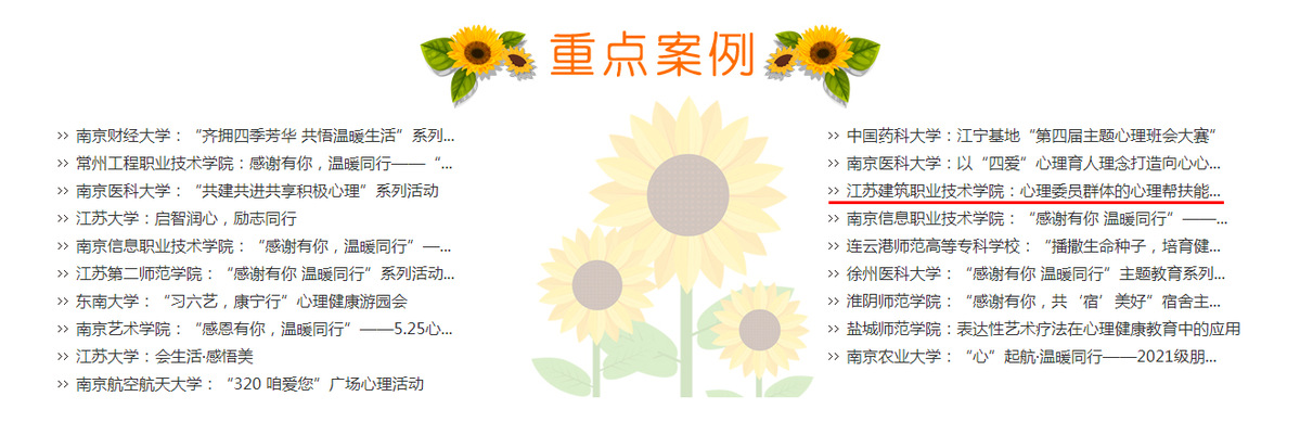 近日,从江苏省教育厅获悉,我校心理健康教育中心教师王庆鸾、厉童报送的案例“朋辈互助领雁计划:心理委员群体的心理帮扶能力与技能提升”入选“‘感谢有你 温暖同行’大学生心理健康教育江苏行主题教育”活动重点案例。该活动由江苏省教育厅主办,于3月20日启动,共遴选出10个典型案例、19个重点案例、22个优秀案例向全省高校展示。