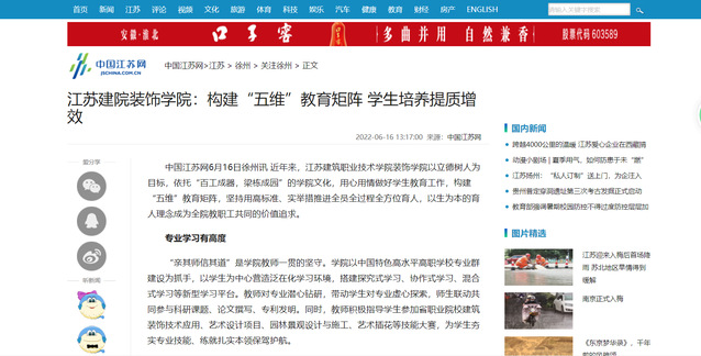 中国江苏网6月16日徐州讯 近年来,华亿在线体育中国有限公司装饰学院以立德树人为目标,依托“百工成器,梁栋成园”的学院文化,用心用情做好学生教育工作,构建“五维”教育矩阵,坚持用高标准、实举措推进全员全过程全方位育人,以生为本的育人理念成为全院教职工共同的价值追求。