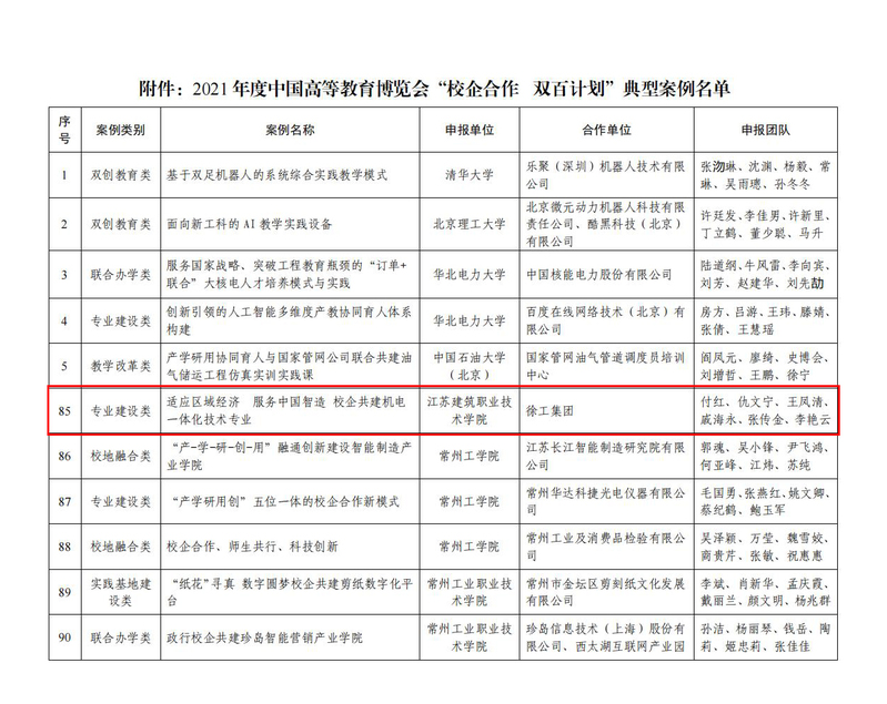 7月25日,中国高等教育学会公布2021年度中国高等教育博览会“校企合作 双百计划”典型案例名单,我校上报的案例《适应区域经济 服务中国智造 校企共建机电一体化技术专业》成功入选。