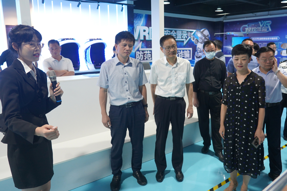 活动中,朱东风重点介绍了学校防范电信网络诈骗体验中心的建设理念与使用情况,并围绕提高大学生反诈能力、建强技防手段、开展精准防诈宣传等主题同调研人员进行了深入探讨。梁惠向在场人员简要介绍了中心的功能分区、技术依托以及运行模式。