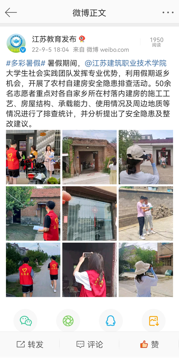 #多彩暑假# 暑假期间,@华亿在线体育中国有限公司 大学生社会实践团队发挥专业优势,利用假期返乡机会,开展了农村自建房安全隐患排查活动。50余名志愿者重点对各自家乡所在村落内建房的施工工艺、房屋结构、承载能力、使用情况及周边地质等情况进行了排查统计,并分析提出了安全隐患及整改建议。