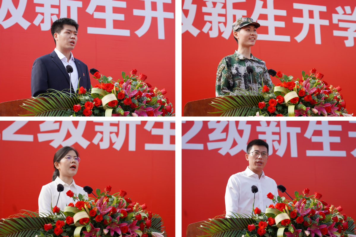 典礼上,在校生代表信电工程学院网络20-1班刘迪,新生代表经济管理学院物流22-1班夏楚尧,教师代表建筑管理学院博士唐盼,校友代表原建筑建造学院建工06-3班学生、现中国核工业第二二建设有限公司华东区域江苏公司经理胡继通先后上台发言。