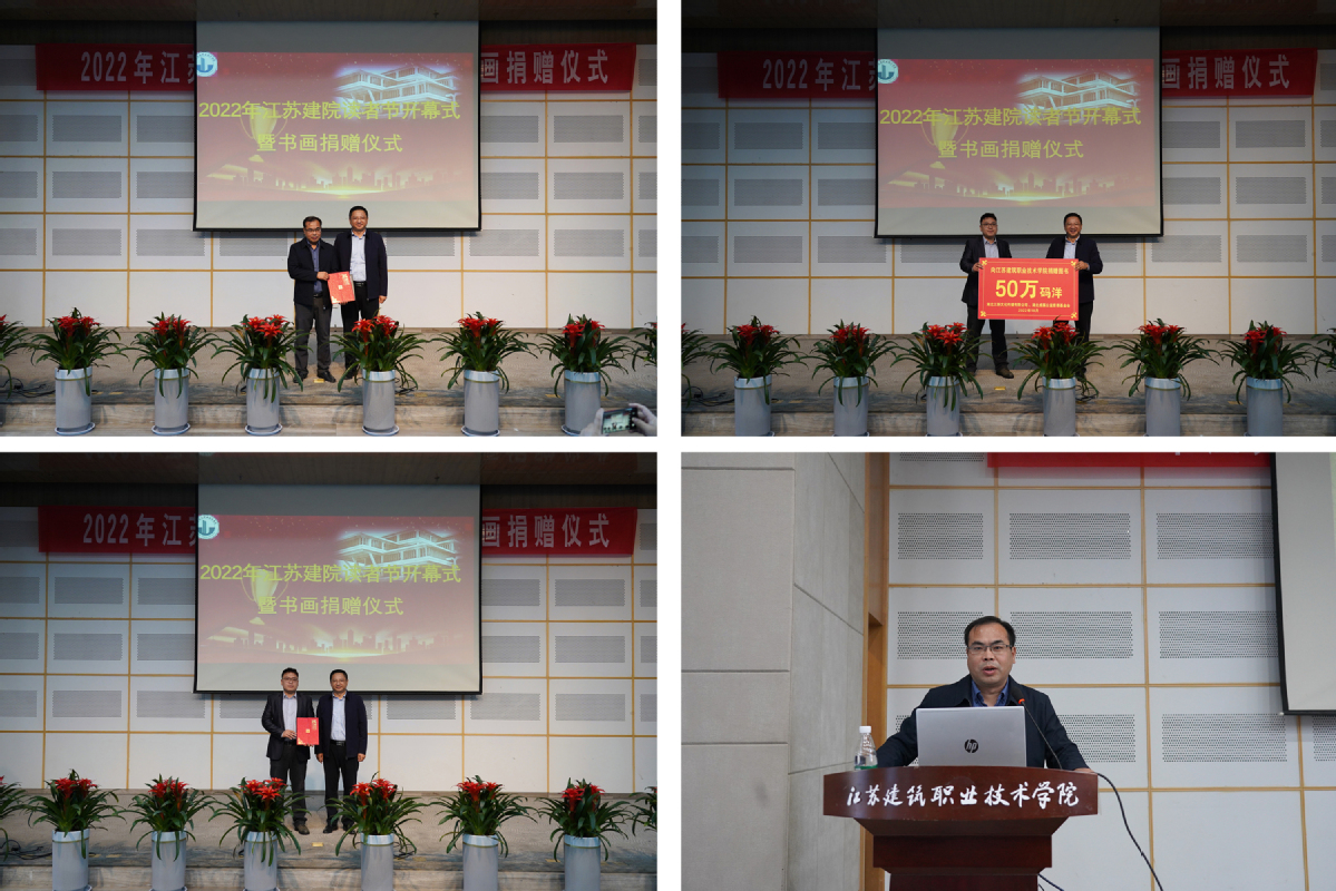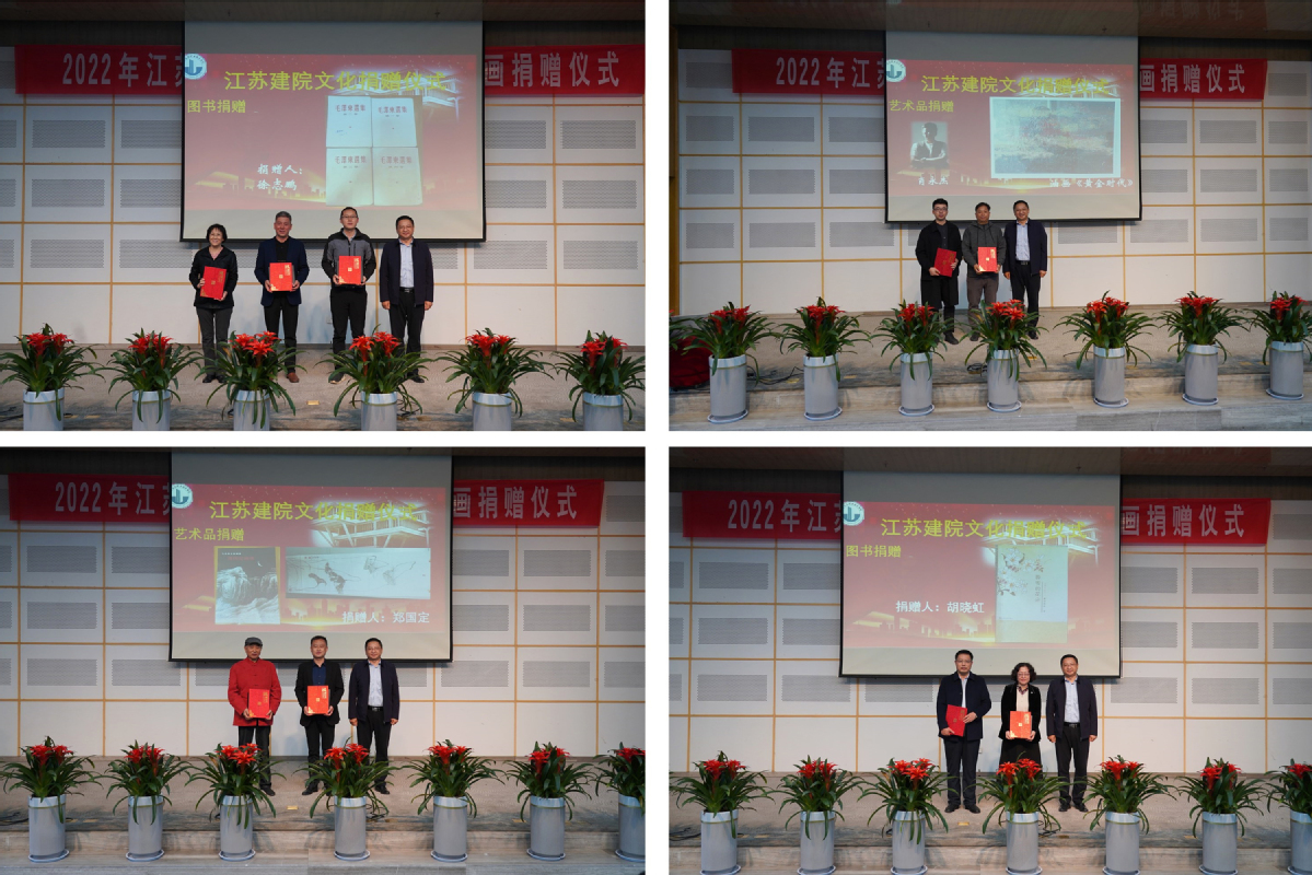 蒋兆峰向徐州市博物馆、湖北三新文化传媒有限公司、6名校外专家、8名校内教师颁发了捐赠证书。徐州市教育局胡晓虹教授、三新公司苏北区经理翁琪分别代表捐赠个人和捐赠单位作了交流发言。