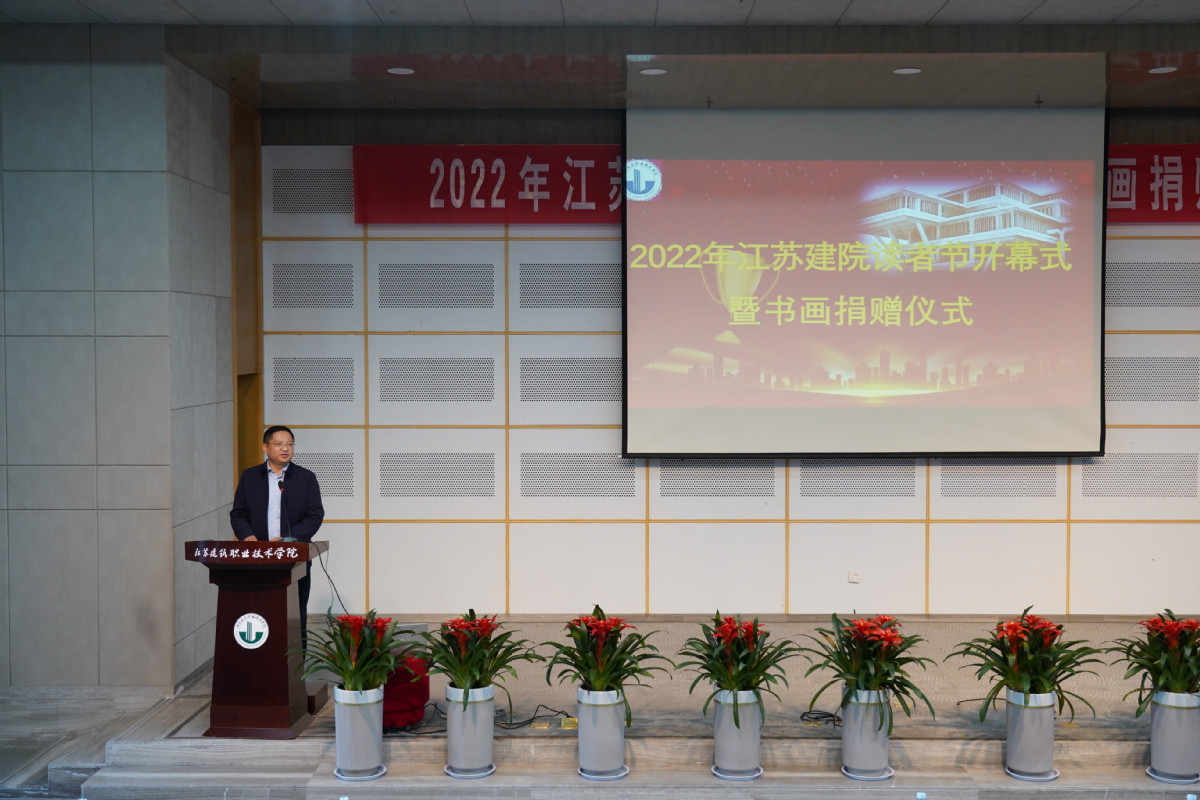 10月18日下午,2022年江苏建院读者节开幕式暨书画捐赠仪式在图书馆报告厅举行。副校长蒋兆峰出席活动并宣布2022年江苏建院读者节开幕。来自校内外的文化学者、艺术家、教师及学生代表参加仪式。