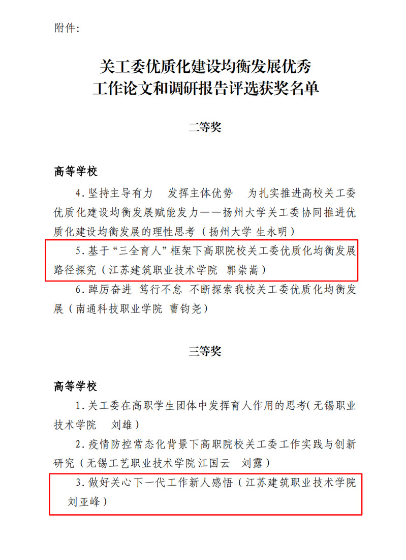 近日,江苏省教育系统关工委公布2022年度关工委优质化建设均衡发展优秀工作论文和调研报告评选结果,我校信电工程学院专职辅导员、二级关工委秘书长郭崇嵩撰写的《基于“三全育人”框架下高职院校关工委优质化均衡发展路径探究》获高校组二等奖,校关工委副秘书长刘亚峰撰写的《做好关心下一代工作新人感悟》获高校组三等奖。