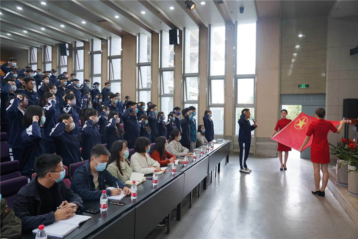 启动会上,梁惠代表学校党委向学员代表赠送了学习资料包,全体2022级团支书面向团旗重温了入团誓词。