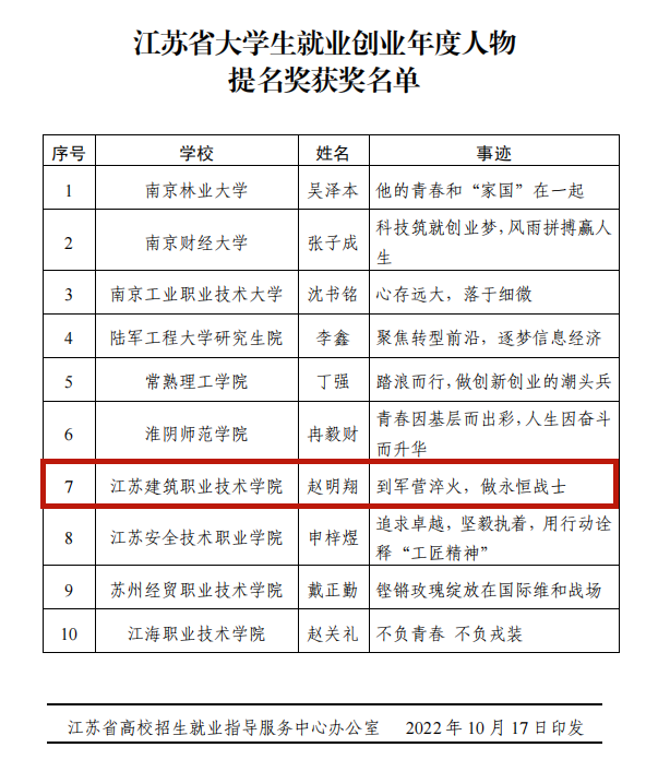 近日,江苏省高校招生就业指导服务中心公布了江苏省大学生就业创业年度人物典型事迹征集活动结果,我校建筑建造学院地下19-1班学生赵明翔荣获江苏省大学生就业创业年度人物提名奖。
