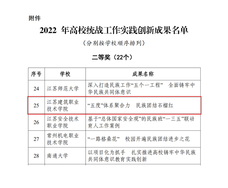 11月3日,江苏省委教育工委公布了2022年高校统战工作实践创新成果征集活动遴选结果,我校报送的《“五度”体系聚合力 民族团结石榴红》成果项目荣获二等奖。
