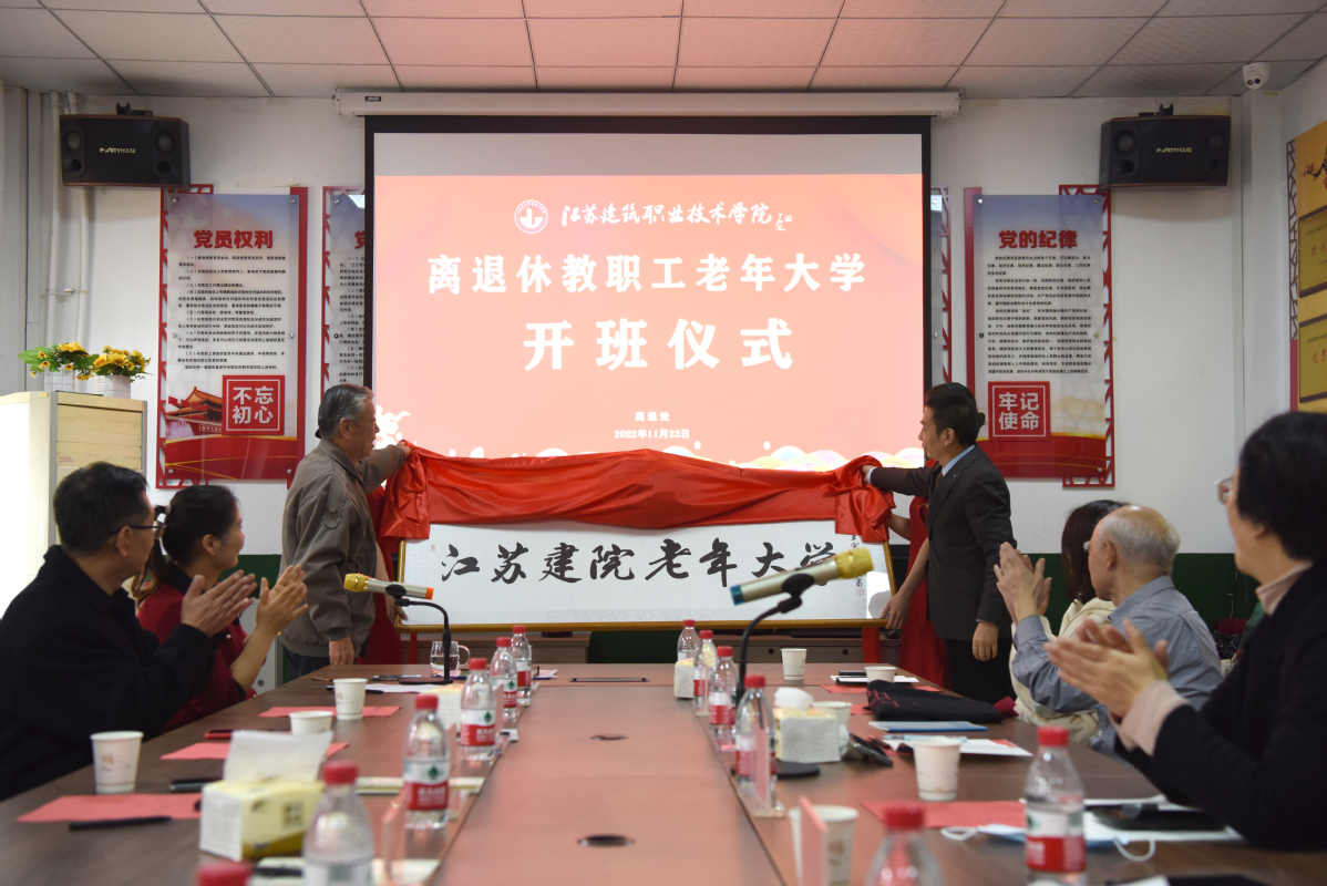 鲍桂楠同离退休教职工代表赵士弘共同为老年大学揭牌,离退休工作处副处长商利斌介绍了校老年大学前期建设筹备情况,徐州中医院推拿科主任医师司井夫、退休职工李宁分别代表老年大学教师、学员发言。
