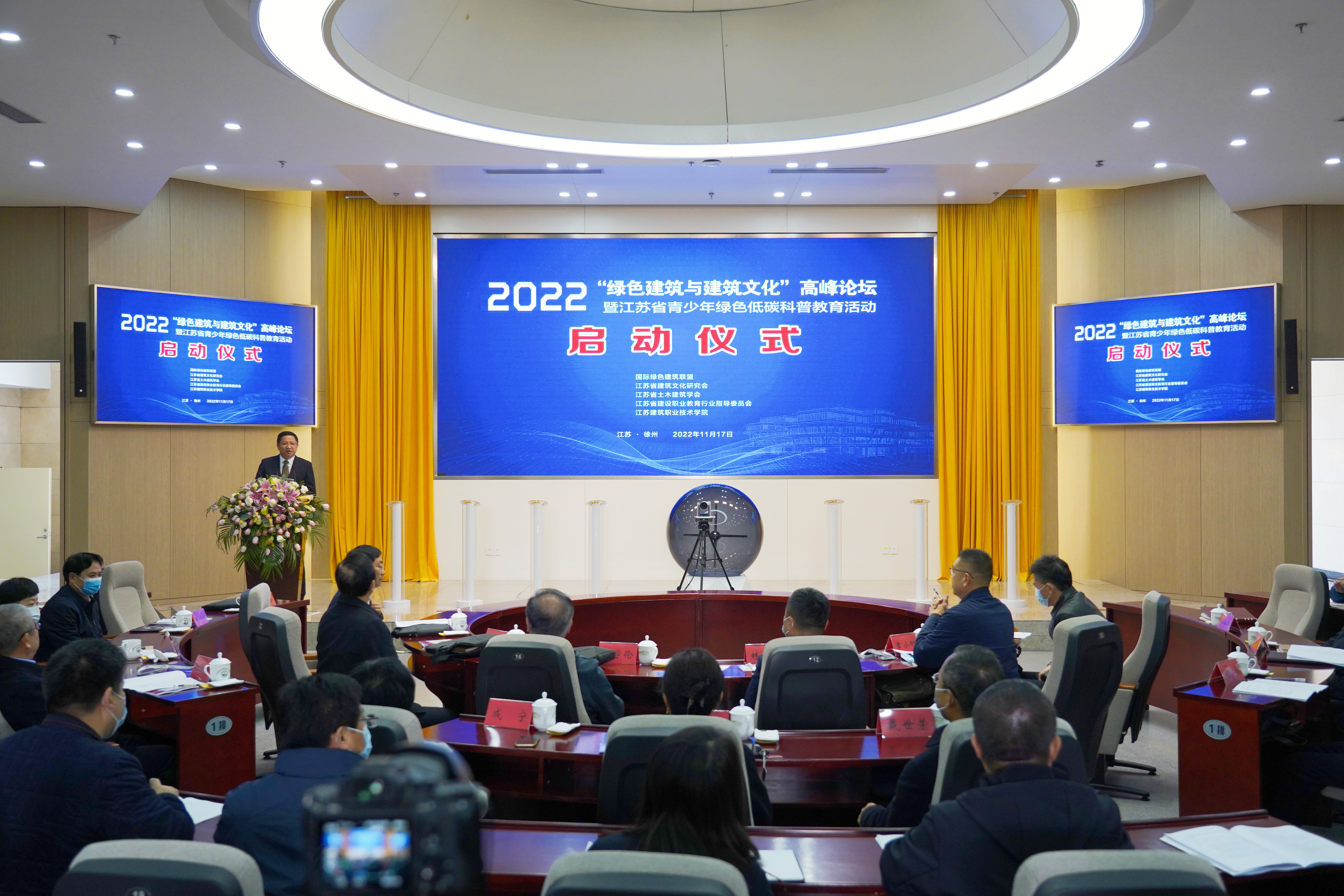 11月17日,由国际绿色建筑联盟、江苏省建筑文化研究会、江苏省土木建筑学会、江苏省建设职业教育行业指导委员会和我校联合主办的2022年“绿色建筑与建筑文化”高峰论坛暨江苏省青少年绿色低碳科普教育活动启动仪式在学术报告厅隆重举行。徐州市人民政府副市长林斌,省住建厅原副厅长、省房地产协会会长杜学伦,省住建厅原二级巡视员、省建设职业教育行业指导委员会主任、省建筑文化研究会常务副会长章小刚,省住建厅原二级巡视员、省建筑装饰协会会长王有党,省教育厅职教处处长徐庆,省勘察设计协会常务副会长、秘书长刘宇红,省建设教育协会副会长、秘书长成宁出席启动仪式。校党委书记朱东风、校长沈士德、党委副书记梁惠、副校长鲍桂楠、纪委书记朱作付、副校长刘海波、副校长蒋兆峰以及学校相关专业师生代表参加启动仪式。启动仪式由蒋兆峰主持。
