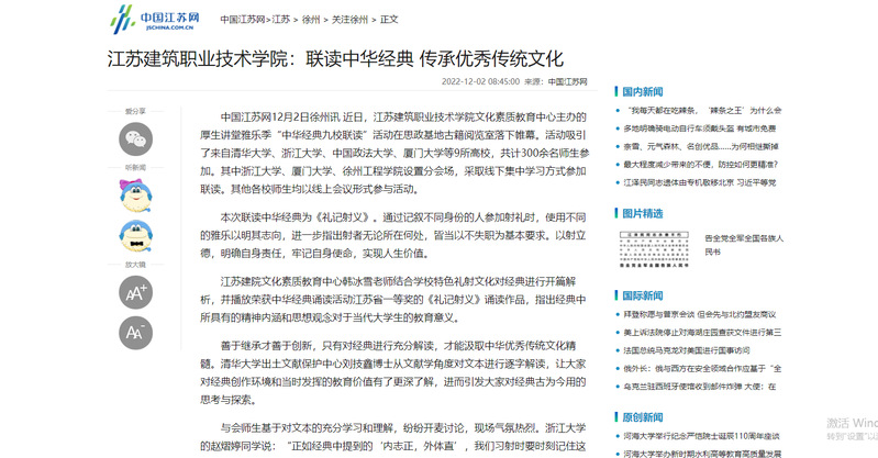 “中华经典是古圣先贤留给我们的宝贵文化遗产,学习好、利用好、保护好、传承好,是每一位炎黄子孙的职责所在。”江苏建院党委副书记梁惠表示, “学校高度重视中华优秀传统文化教育,先后建成中国礼射文化展览馆、礼射场、古籍阅览室、思想政治教育基地等一批文化场馆。打造沉浸式、交互式、立体式传统文化学习环境,建设厚生讲堂,开发文化素养课程,培育特色社团,以这些传统文化学习资源,与兄弟院校师生保持定期交流,引入校外优秀教学资源,为师生提供多方位、多维度、多模式、多场域的传统文化学习平台。切实做好高职教育与中华优秀传统文化相结合系列工作,提高师生人文素养,坚定文化自信,做到文化自强。” (韩冰雪)