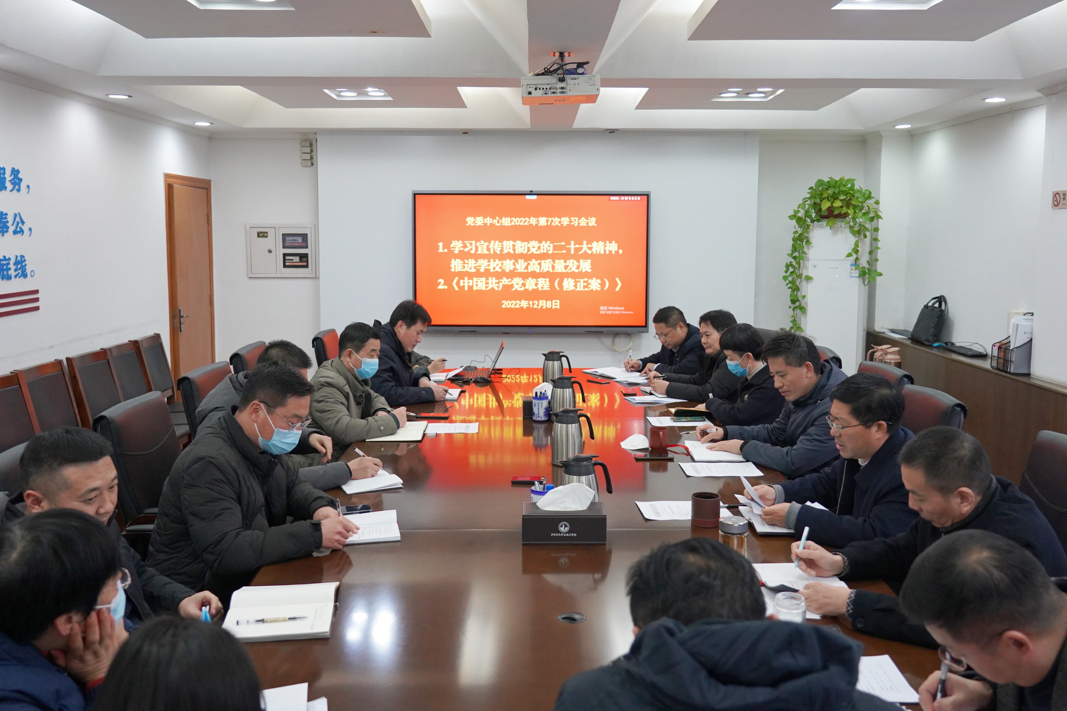 12月8日下午,学校党委理论学习中心组在行政楼第一会议室召开2022年第7次学习会议,主要议题为学习宣传贯彻党的二十大精神,推进学校事业高质量发展和《中国共产党章程(修正案)》。党委书记朱东风主持会议,校党委理论学习中心组成员参加学习。