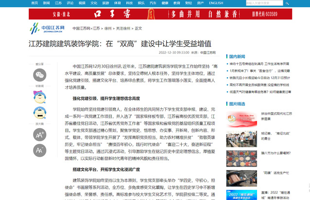 中国江苏网12月30日徐州讯 近年来,江苏建院建筑装饰学院学生工作始终坚持“高水平建设、高质量发展”总体要求,坚持立德树人根本任务,坚持学生主体地位,通过强化党建引领、搭建文化平台、培养综合素质,将学生工作落细落小落实,全面提高人才培养质量。