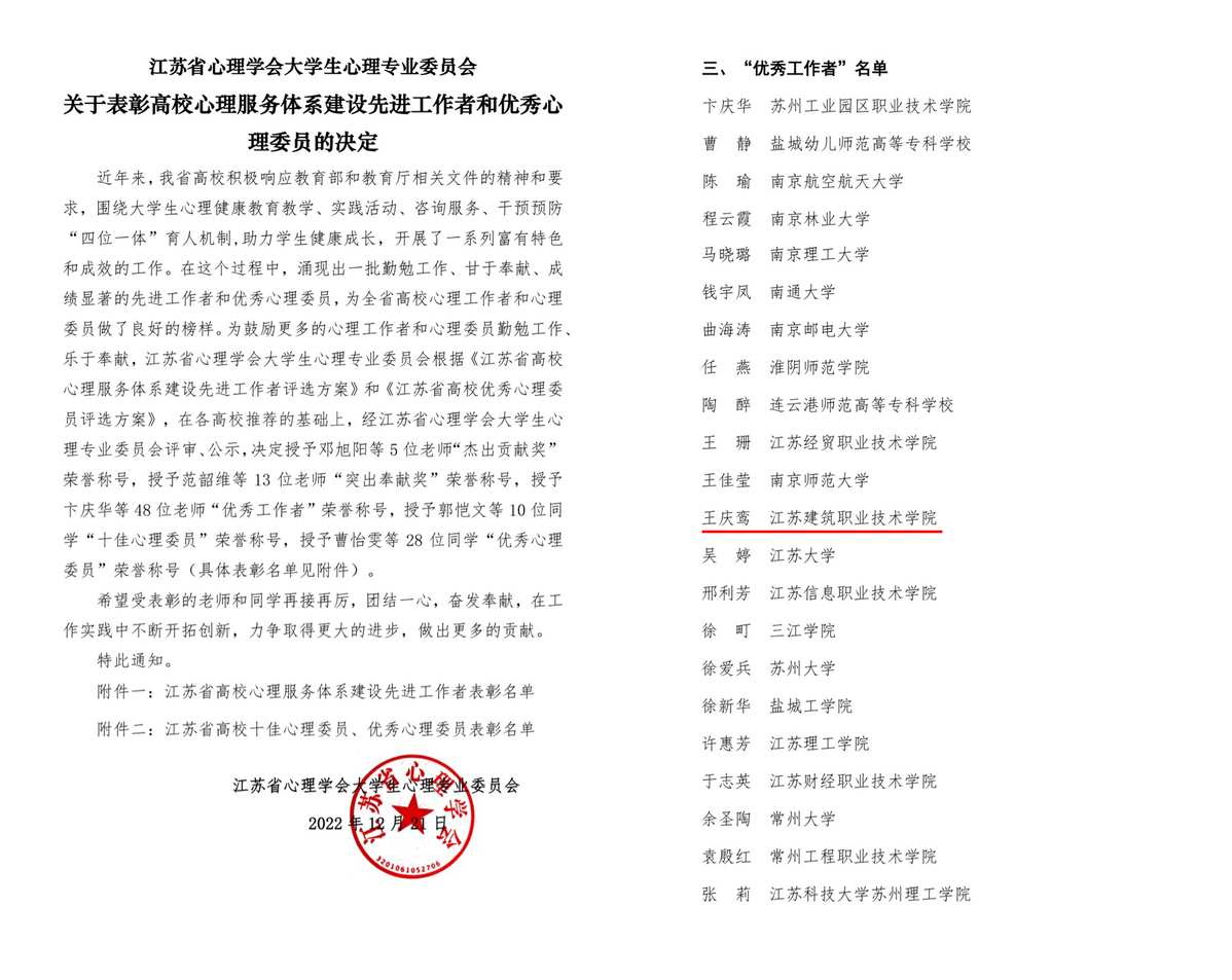 近日,江苏省心理学会大学生心理专业委员会公布了江苏省高校心理服务体系建设先进工作者和优秀心理委员评选结果,我校心理健康教育中心王庆鸾老师获评“优秀工作者”荣誉称号。