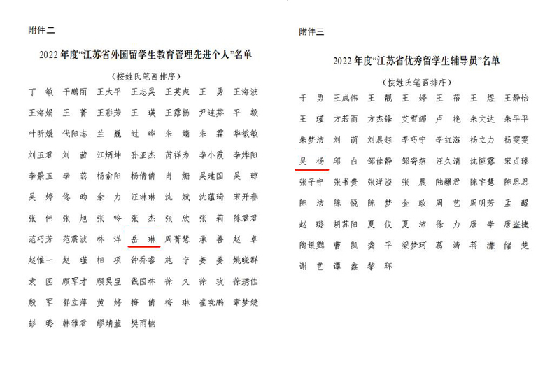 近日,江苏省高等教育学会外国留学生教育管理研究委员会公布2022年度表彰名单。我校国际交流学院教师岳琳获评“江苏省外国留学生教育管理先进个人”称号,吴杨获评“江苏省优秀留学生辅导员”称号。