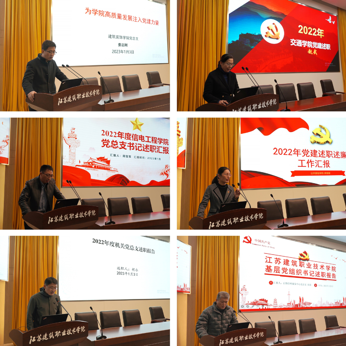 会前,各二级党总支、直属党支部向学校党委提交了书面述职报告。会上,建筑装饰学院党总支、交通工程学院党总支、信电工程学院党总支、公共基础学院党总支、机关党总支、后勤管理服务中心党总支六家单位作为代表进行了现场述职。述职紧扣主题、实事求是,既直面自身不足,又提出了整改措施。