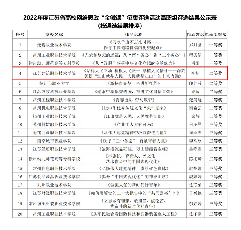 近日,江苏省高校网络思想政治工作中心公布了2022年度江苏省高校网络思政“金微课”征集评选活动结果,我校艺术设计学院李楠老师微课作品《站稳人民立场 植根人民沃土 厚植人民情怀——深刻领悟“江山就是人民,人民就是江山”的丰富内涵》荣获二等奖。