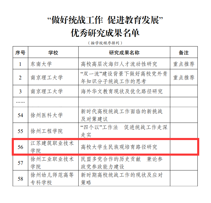 近日,江苏省委教育工委公布了“做好统战工作 促进教育发展”优秀研究成果征集活动评选结果,我校信电工程学院教师白金一主笔的研究报告《高校大学生民族观培育路径研究》获评“优秀研究成果”。