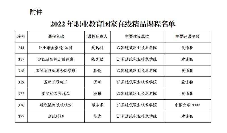 1月12日,教育部公布了2022年职业教育国家在线精品课程名单,我校《职业形象塑造36计》《建筑装饰施工图绘制》《工程招投标与合同管理》《基础工程施工》《钢结构工程施工》《建筑装饰表现技法》《建筑结构》7门课程成功入选,为学校“双高计划”建设再添标志性成果。