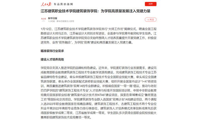 学院党总支深入推进学院的品牌和特色建设。近年来,学院紧盯装饰行业发展需求,建设完成教育部职业教育建筑装饰工程技术专业教学资源库建设,完成建筑装饰工程技术专业江苏省品牌特色专业建设,牵头申报建筑装饰工程技术专业全国职业技能大赛,牵头成立全国建筑装饰联盟,牵头承办全国装配式装修职业技能大赛,组织开展全国室内设计“1+X”师资培训,高质量推进建筑装饰“双高”A档专业群建设。积极响应国家“一带一路”倡议,推动与老挝巴巴萨学院的“建筑装饰工程技术专业”人才培养与标准开发国际培训班,申报中非职业教育坦桑尼亚国家职业标准“建筑室内设计技术员NTA6”建设项目,探索在柬埔寨成立“鲁班营造工坊”等国际化交流项目。学院建筑装饰专业群入选国家“双高计划”A档建设项目,两个课程入选2022年职业教育国家在线精品课程,建筑装饰工程技术、古建筑工程技术两个专业位列金平果2022年高职专业竞争力排行榜首位,建筑装饰人才培养模式改革创新成果先后获得国家级教学成果二等奖、江苏省教学成果一等奖,学生团队多次获得全国职业院校技能大赛高职组建筑装饰技术应用赛项一等奖。