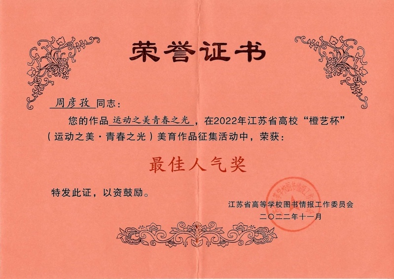 近日,2022年江苏省高校“橙艺杯”运动之美、青春之光·美育作品征集活动公布获奖名单,我校建筑装饰学院古建22-2班学生周彦孜作品《运动之美∙青春之光》获“最佳人气奖”。