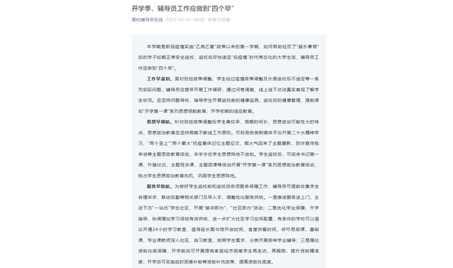 本学期是新冠疫情实施“乙类乙管”政策以来的第一学期,如何帮助经历了“超长寒假”后的学子如期正常安全返校,返校后尽快适应“后疫情”时代常态化的大学生活,辅导员工作应做到“四个早”。