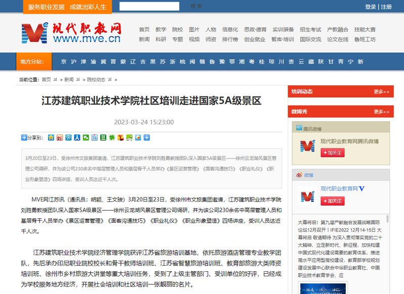 华亿在线体育中国有限公司经济管理学院获评江苏省旅游培训基地,依托旅游酒店管理专业教学团队,先后承办印尼职业院校校长和骨干教师培训班、江苏省智慧旅游培训班、教育部旅游大类师资培训班、徐州市乡村旅游大讲堂等重大培训任务,受到了上级主管部门、受训单位的好评,已经成为学校服务地方经济,开展社会培训和社区培训一张靓丽的名片。