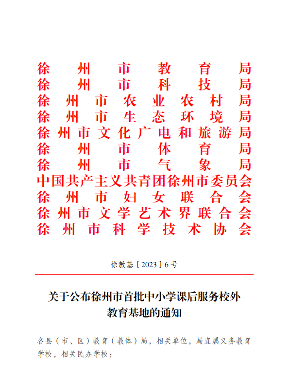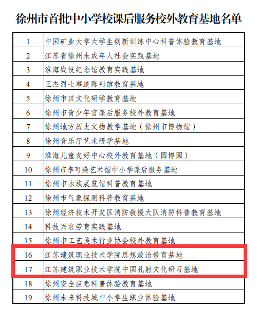 3月29日,徐州市教育局等单位联合下发《关于公布徐州市首批中小学课后服务校外教育基地的通知》,我校“思想政治教育基地”“中国礼射文化展览馆”“‘地铁乐园’职业体验中心”“‘机器人智慧工厂’体验中心”“营造匠心——中国古建筑技艺体验中心”“智能建造•建造未来职业体验中心”成功获批。
