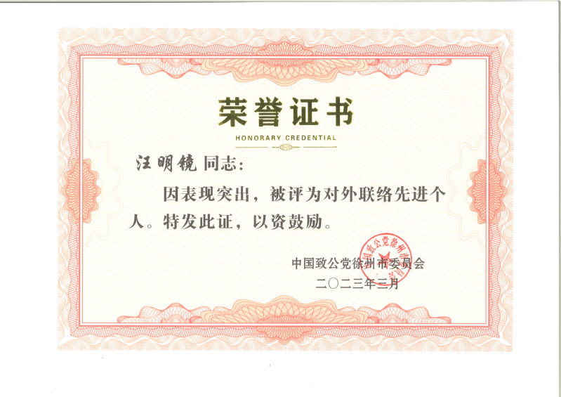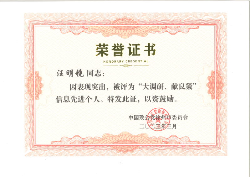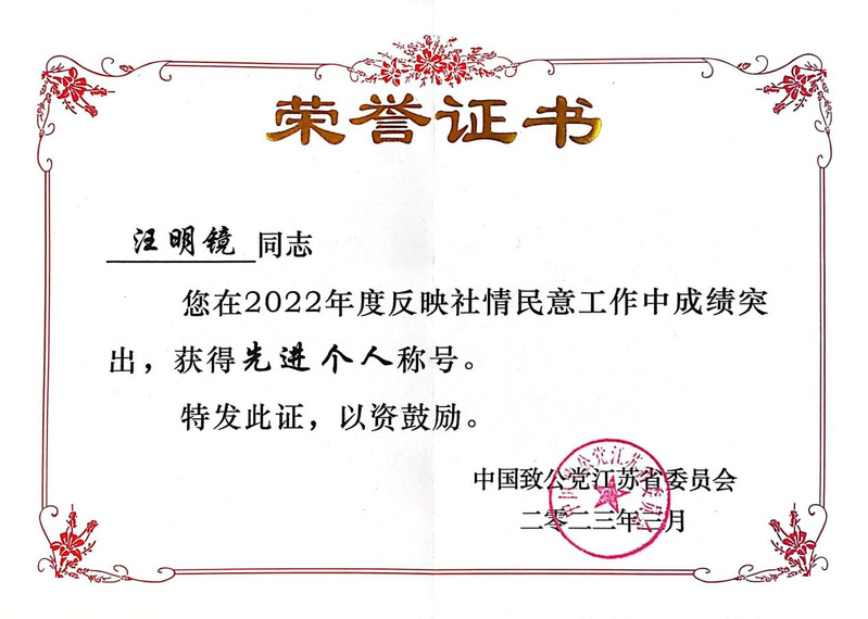 近日,中国致公党江苏省委员会下发《关于表彰2022年度优秀社情民意信息、反映社情民意信息工作先进集体和先进个人的决定》(致苏省发〔2023〕5号),致公党党员、我校建筑装饰学院汪明镜博士荣获“社情民意信息工作先进个人”称号。此外,在致公党徐州市委会2022年度工作总结暨表彰大会上,汪明镜被评为“大调研、献良策”信息先进个人和对外联络先进个人。
