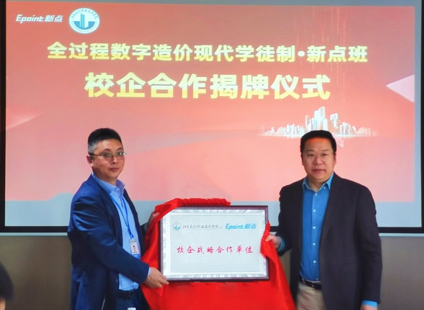 洽谈结束后,校企双方签订了现代学徒制人才培养合作协议书,举行了“校企战略合作单位”揭牌仪式、“新点班”产业导师聘书颁发仪式。此外,企业还捐赠了价值七万元的建筑行业系列软件。