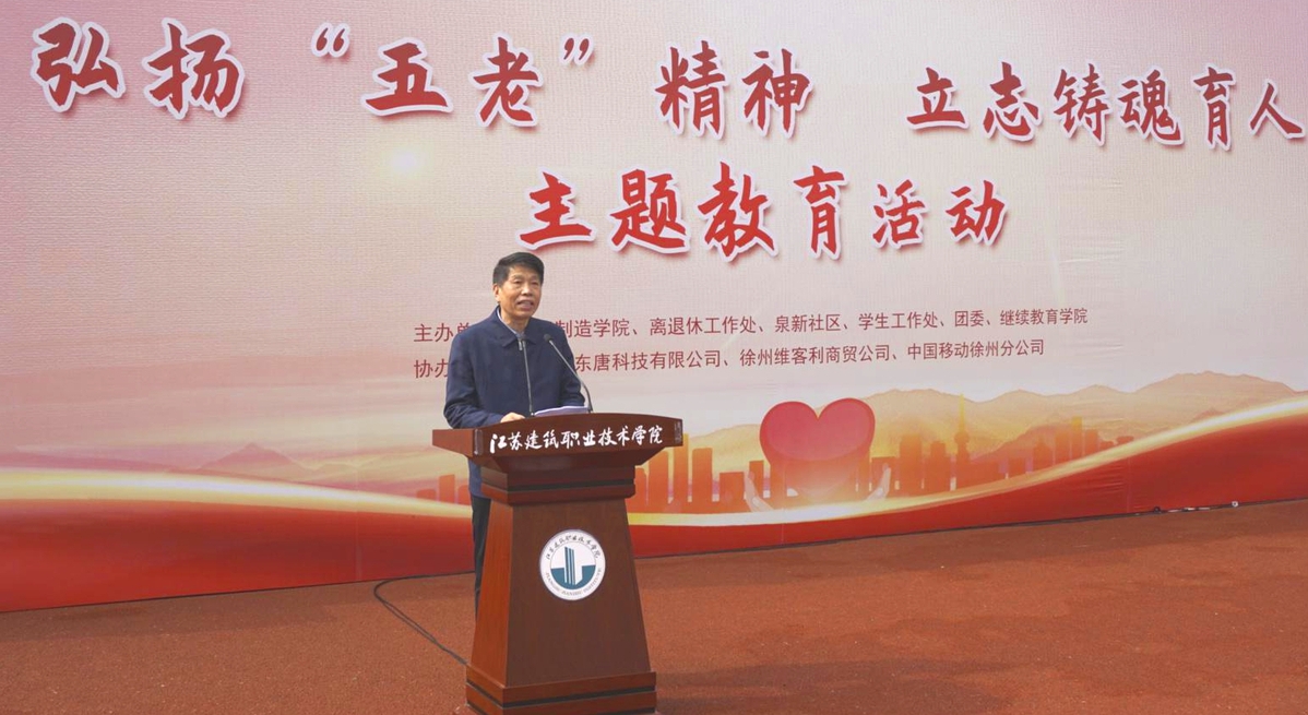 鲍桂楠宣布弘扬‘五老’精神 立志铸魂育人”主题教育活动开幕。宋农村代表徐州市关工委为本次主题教育活动致词,他肯定了我校关工委发挥的优势和作用,期望校地双方同心协力,为新时代青年学生健康成长贡献力量。