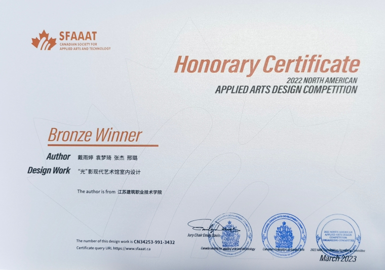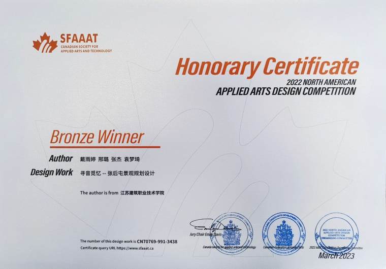 近日,由我校艺术设计学院建筑动画技术专业教师团队共同设计的作品《寻音觅忆——张后屯景观规划设计》《“光”影现代艺术馆室内设计》在北美应用艺术设计大赛决赛中获得铜奖;作品《境愈·京杭运河——荆山景观改造更新规划设计》在第三届G CROSS创意奖大赛决赛中获得铜奖。