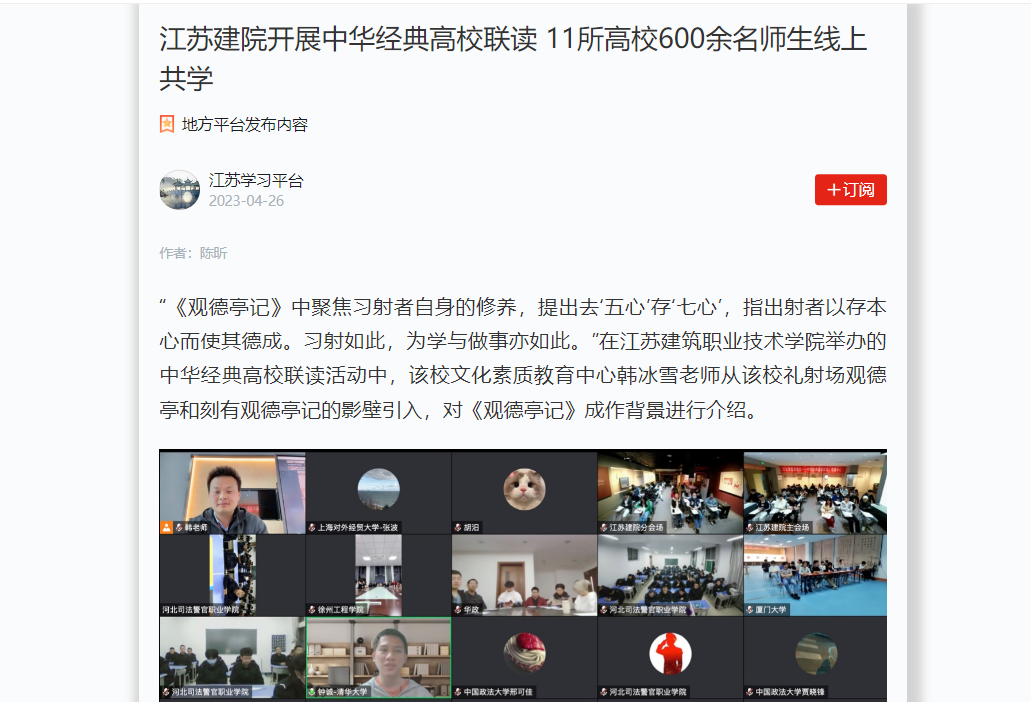 此次中华经典高校联读活动在该校思政教育基地启动,吸引了来自本校及清华大学、浙江大学、中国政法大学、华东政法大学、厦门大学、上海对外经贸大学、江苏师范大学、淮北师范大学、徐州工程学院、河北司法警官职业学院等11所高校,600余名师生参加。