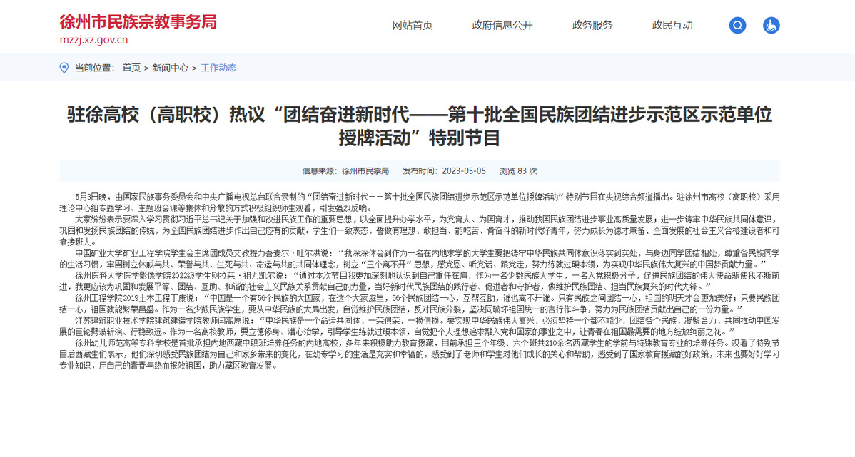 5月3日晚,由国家民族事务委员会和中央广播电视总台联合录制的“团结奋进新时代——第十批全国民族团结进步示范区示范单位授牌活动”特别节目在央视综合频道播出。驻徐州市高校(高职校)采用理论中心组专题学习、主题班会课等集体和分散的方式积极组织师生观看,引发强烈反响。