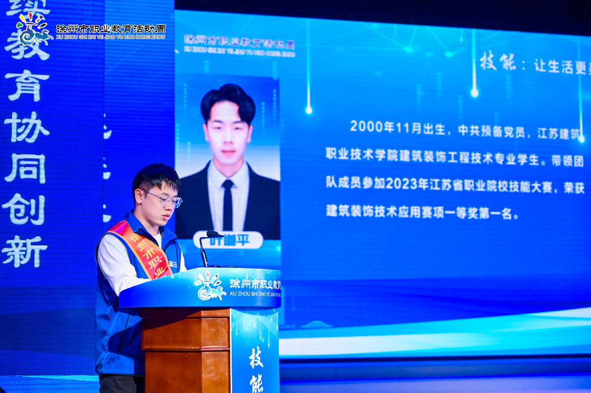 5月22日,由徐州市教育局、徐州市总工会主办,2023年职业教育办学成果展示暨劳模工匠产业导师“薪火工程”启动仪式在江苏模特艺术学院举办,获得2023年江苏省职业院校技能大赛一等奖的我校建筑装饰学院建筑装饰专业学生叶道平受邀发言,并与室内设计专业学生侯小鹏共同被聘为徐州市首批职业院校“未来工匠”。